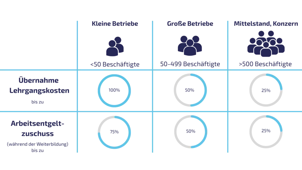 Die Höhe der Förderung richtet sich nach der Größe deines Unternehmens. Es gibt zwei zentrale Hebel: die Übernahme der Lehrgangskosten und einen Zuschuss zum Arbeitsentgelt während der Weiterbildung.